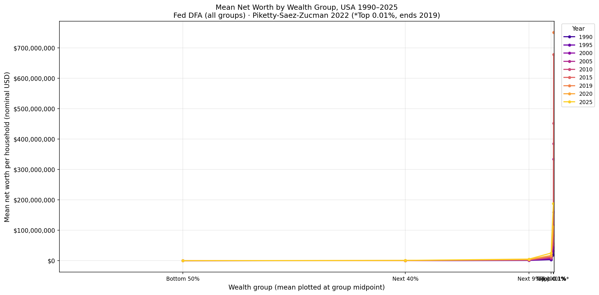 Mean net worth per adult by wealth group, animated annually. Adjusted for inflation to 2019 dollars.
